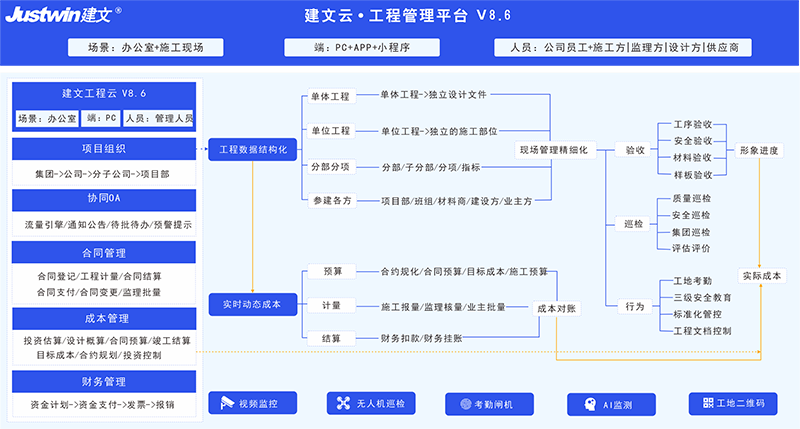 建文云(水利基建版)具有運(yùn)河工程特色的項(xiàng)目管理云平臺(tái),全面覆蓋運(yùn)河工程建設(shè)管理的各個(gè)層面、各個(gè)環(huán)節(jié),構(gòu)建工程管理的資訊溝通平臺(tái),用工程合同體系明確項(xiàng)目各方的責(zé)、權(quán)、利,為業(yè)主、建設(shè)管理、設(shè)計(jì)、監(jiān)理、施工、供應(yīng)商等工程參建各方提供協(xié)同工作平臺(tái),實(shí)現(xiàn)跨組織、跨地域,以數(shù)據(jù)為中心,面向業(yè)務(wù)主題、面向流程處理,實(shí)現(xiàn)對工程管理全過程、全方位的控制與管理,成為總部各相關(guān)單位、部門及集團(tuán)工程參建各方進(jìn)行工程管理的依托工具。