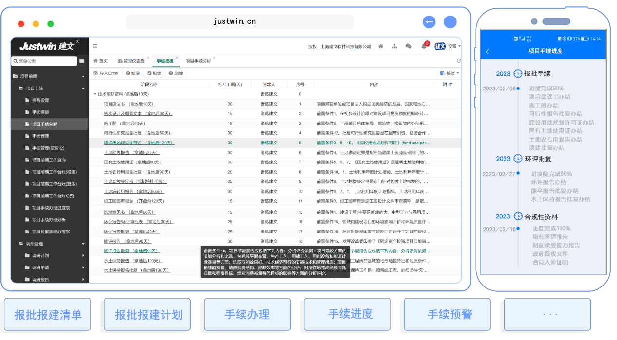 報(bào)批報(bào)建:明確項(xiàng)目前期需辦理的各項(xiàng)手續(xù),如規(guī)劃、國土、環(huán)保等審批流程,并進(jìn)行電子化登記與跟蹤。將項(xiàng)目手續(xù)分解到具體的責(zé)任部門和責(zé)任人,確保每項(xiàng)手續(xù)都有明確的辦理主體和時(shí)間節(jié)點(diǎn)。利用項(xiàng)目管理軟件(如建文云系統(tǒng))進(jìn)行任務(wù)分配和進(jìn)度跟蹤,確保責(zé)任到人。對手續(xù)辦理過程中可能出現(xiàn)超期的情況進(jìn)行提前預(yù)警。當(dāng)某項(xiàng)手續(xù)的辦理時(shí)間接近或超過預(yù)定時(shí)間節(jié)點(diǎn)時(shí),系統(tǒng)自動(dòng)發(fā)出預(yù)警信息,提醒責(zé)任部門和責(zé)任人加快辦理進(jìn)度。