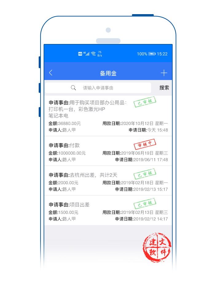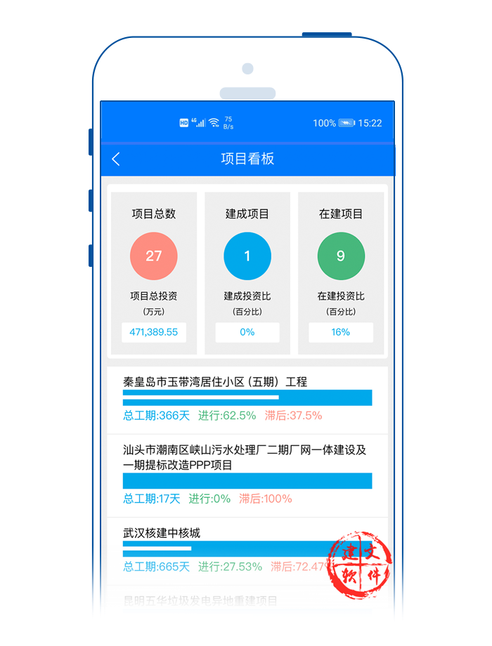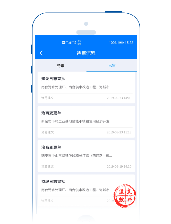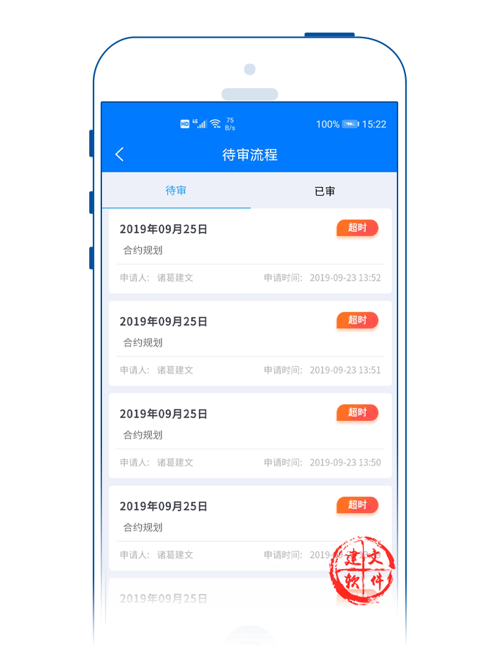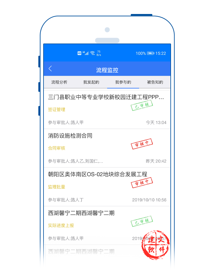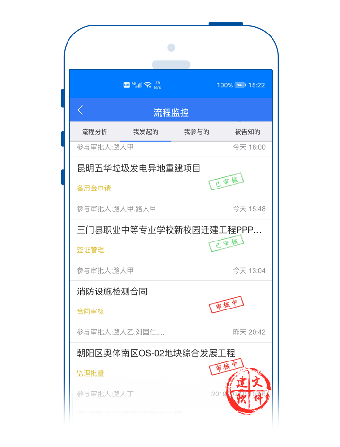 建文流程審批APP對項目各個審批節(jié)點時限進行分類預(yù)警。打開建文建文app,可以看到各個項目都用不同的顏色代表實時進展?fàn)顟B(tài):