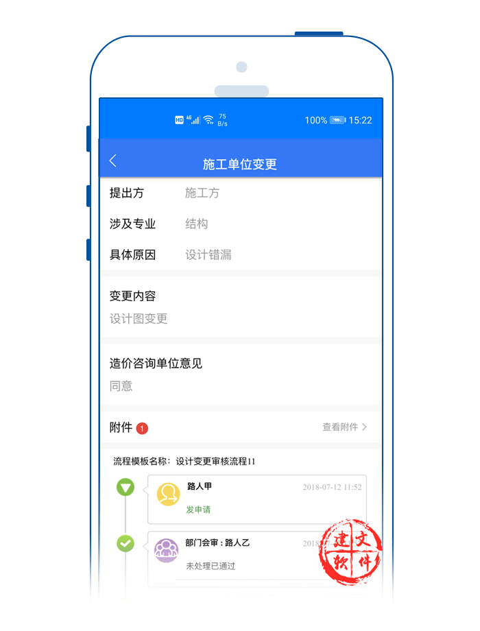 3)APP支持在線多方會審設(shè)計變更;監(jiān)理、建設(shè)單位、設(shè)計方、施工方、業(yè)主方經(jīng)過在線確認(rèn)后,由設(shè)計方通過APP發(fā)出相應(yīng)圖紙或說明,并由監(jiān)理工程師通過建文app,在線簽發(fā)設(shè)計變更單。