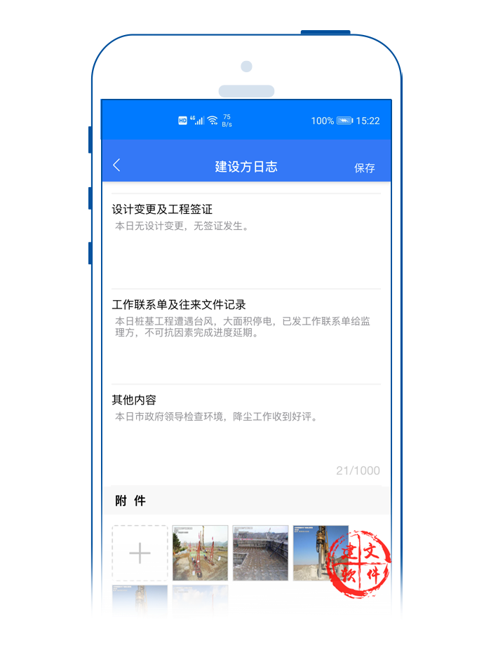 借助建文app“互聯(lián)網(wǎng)+施工日志”,一改傳統(tǒng)紙質(zhì)記錄不易修改,難以保存的問題。同時,結(jié)合實時拍照、短視頻等技術(shù)手段,每天一篇施工日志,對工作發(fā)現(xiàn)問題,隨時記錄。用戶可以通過建文APP設(shè)置提醒時間和方式。每天提醒記錄,日志數(shù)據(jù)保存云端,或下載存儲打印。