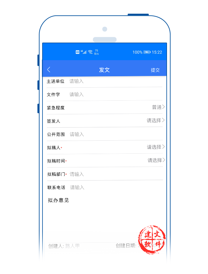 1) 按制發(fā)文件日期、擬稿、主送、簽發(fā)人、密級、標(biāo)題、領(lǐng)導(dǎo)批示、份數(shù)、發(fā)文字號、文種等進行手機端APP登記;