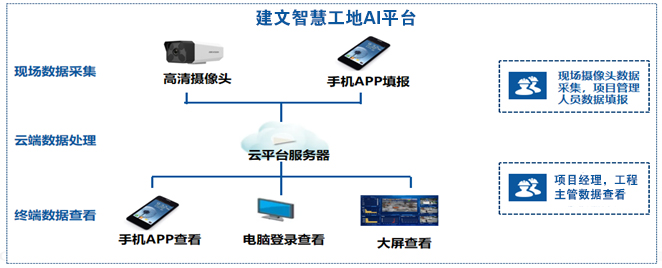 建文智慧工地AI管理平臺,分為數(shù)據(jù)采集層、數(shù)據(jù)處理層、數(shù)據(jù)查看三個層面。工地現(xiàn)場配置高清攝像頭,項目管理人員可通過手機APP上報數(shù)據(jù),數(shù)據(jù)經(jīng)云端服務(wù)器處理后,總部、工程主管、項目經(jīng)理都可通過手機、電腦、監(jiān)控大屏等終端設(shè)備查看。